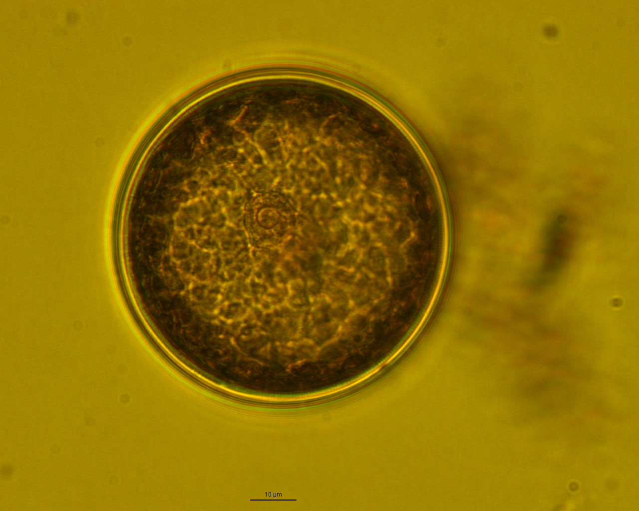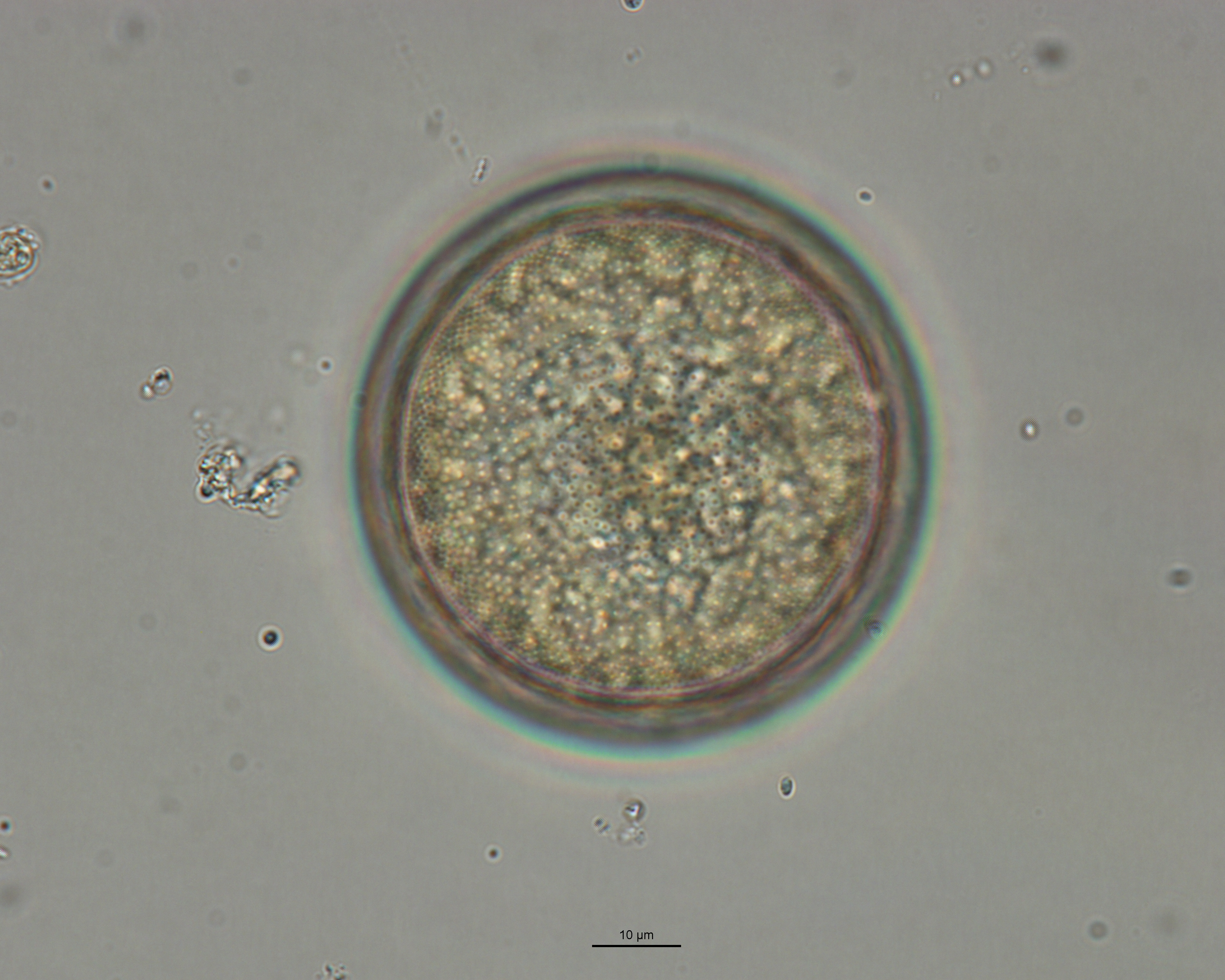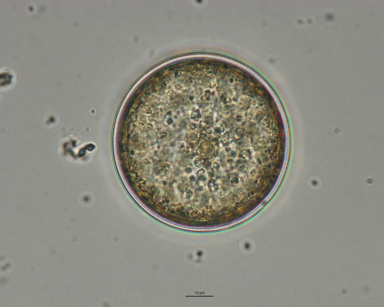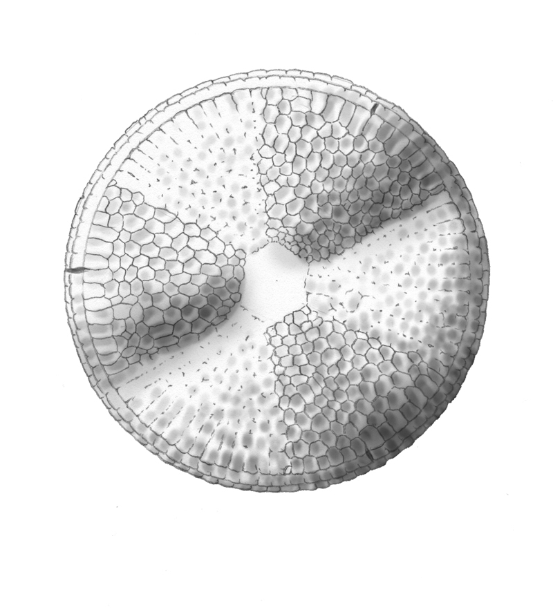 Solitary. In valve view the cells have a discoid shape, while in girdle view they appear rectangular. The valves are divided into a maximum of 20 sectors, which are alternatively raised and depressed, while the central area is smooth or granular. On the outer edge of the raised areas there are prominent rimoportulae, with curved or square internal apertures. Areolae arranged in radial striae can also be seen. The valve mantle often has spines or siliceous excrescences similar to verrucas. In contrast the edge is smooth. The cell contains numerous chloroplasts.